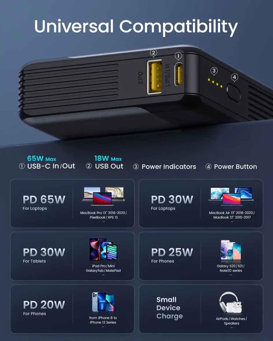 Wide CompatibilityThe portable charger power bank is compatible with MacBook Pro/Air, iPad Pro/Air/Mini, iPhone 13/13 Pro/13 Pro Max/13 Mini, iPhone 12/12 Pro/12 Pro Max/12 Mini, Galaxy S21/S21+/S20/S20+/S10/S10+/Note10/Note10+, Switch, wireless earbuds, Bluetooth speakers, smart watches and more.