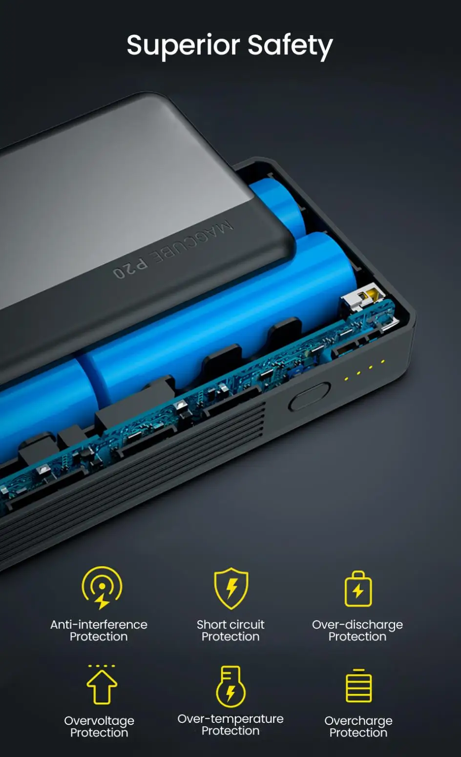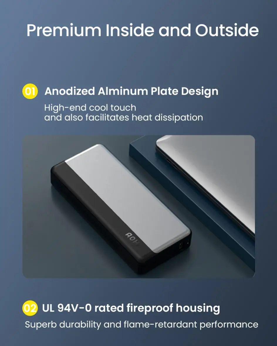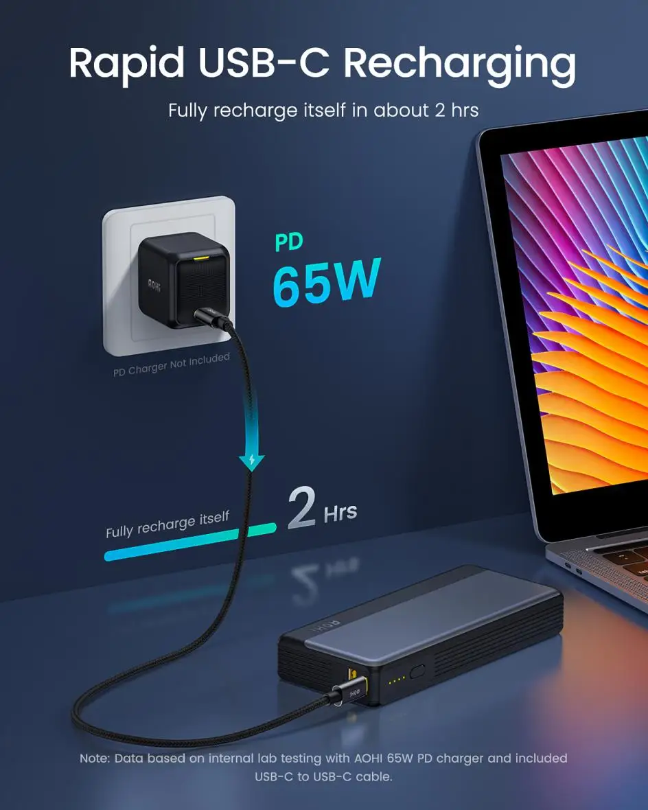 Superior Safety & Rapid RechargeAOHIs advanced safety system effectively protects the PD USBC power bank against overcharge overvoltage, over-temperature, short circuit and more to ensure the safety of you and your devices. Moreover, with 65W PD input, the slim power bank itself can be fully recharged in about 2 hours by using a 65W PD charger (65W PD charger not included).