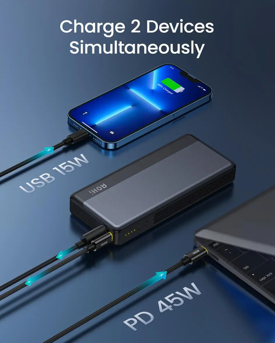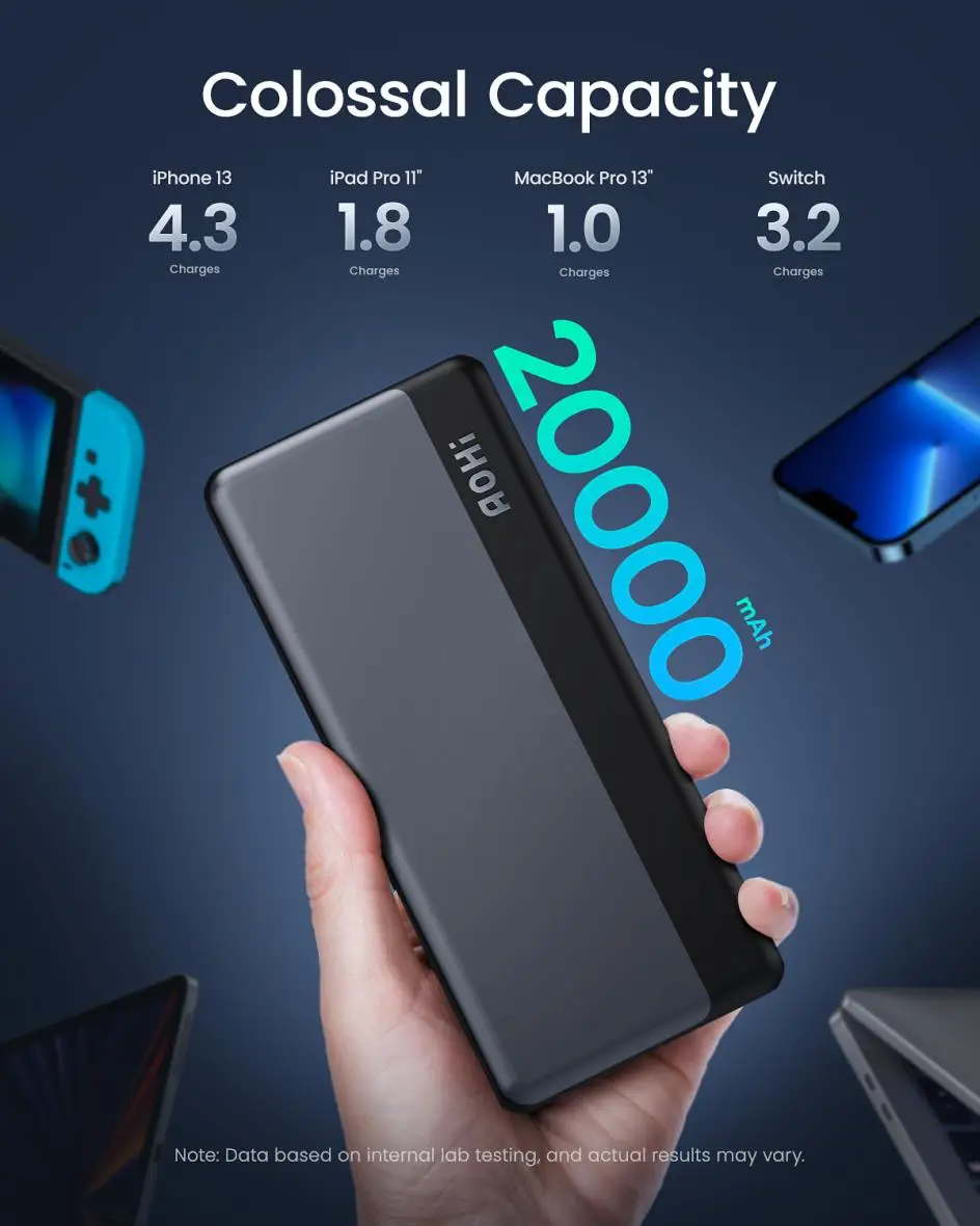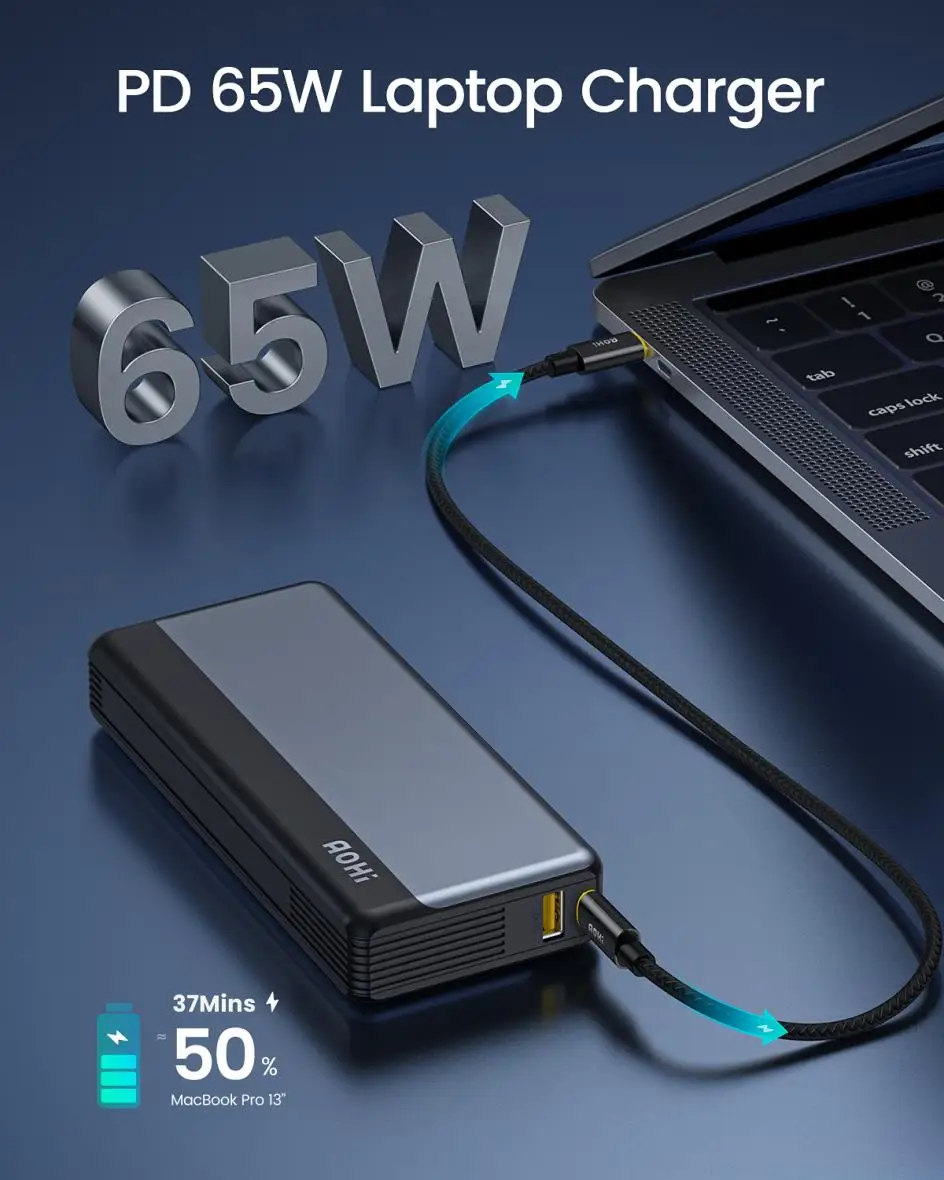 65W Power Delivery Fast ChargerAOHI 20000mAh portable power bank features a PD 65W USB-C port and a 18W USB-A port, allowing you to fast charge your laptop/tablet and phone simultaneously. Powerful 65W PD output provides PD fast charging for MacBook Pro 13″ from 0% to 50% in just 37 minutes, for iPhone 12 from 0% to 50% in about 16 minutes, for iPhone 12 Pro Max from 0% to 50% in about 22 minutes.
