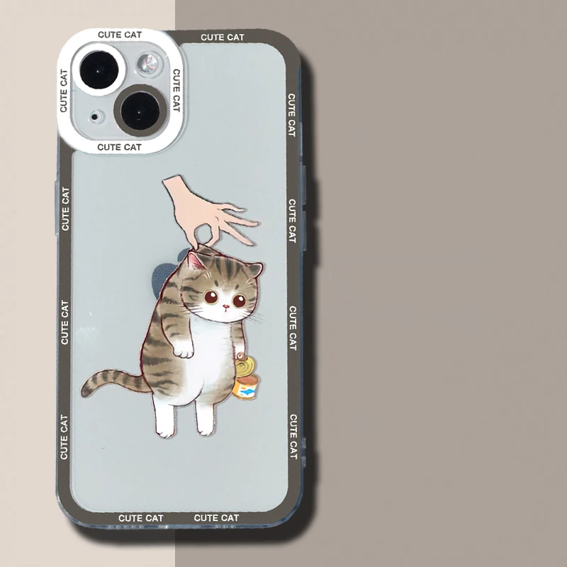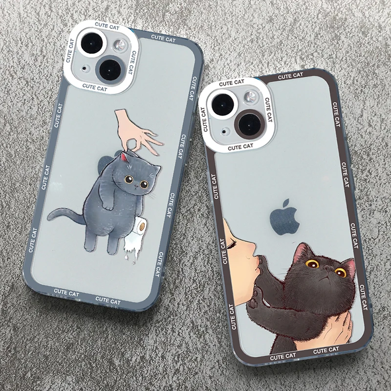 Funny Cute Cartoon Cat Phone Case For iPhone 15 14 13 12 11 Pro Max Mini XS X XR SE 2020 7 8 Plus Transparent Clear Soft Cover