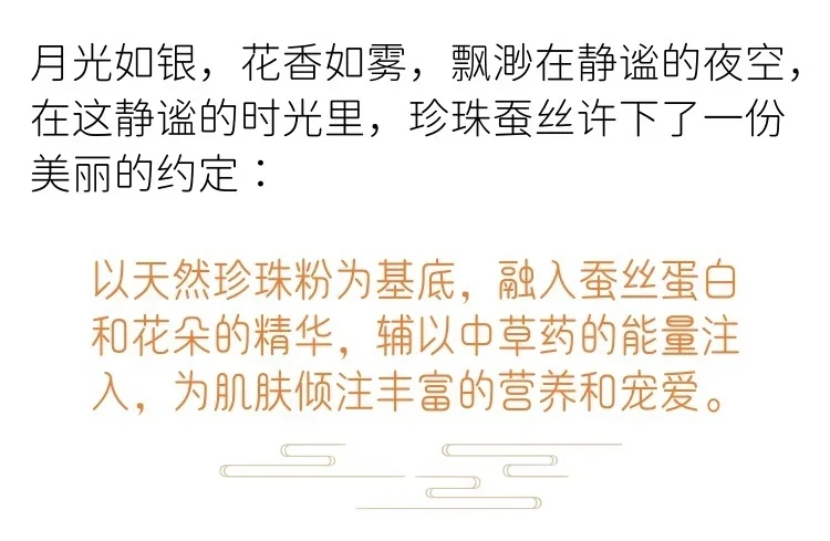 Based on natural pearl powder, infused with silk proteins and flower extracts, it pours rich nutrients and pampering to the skin.