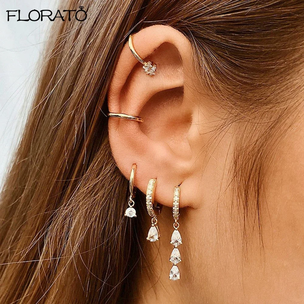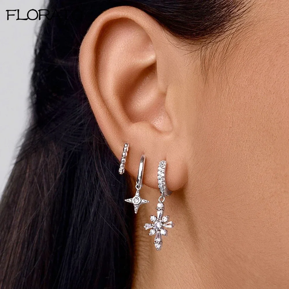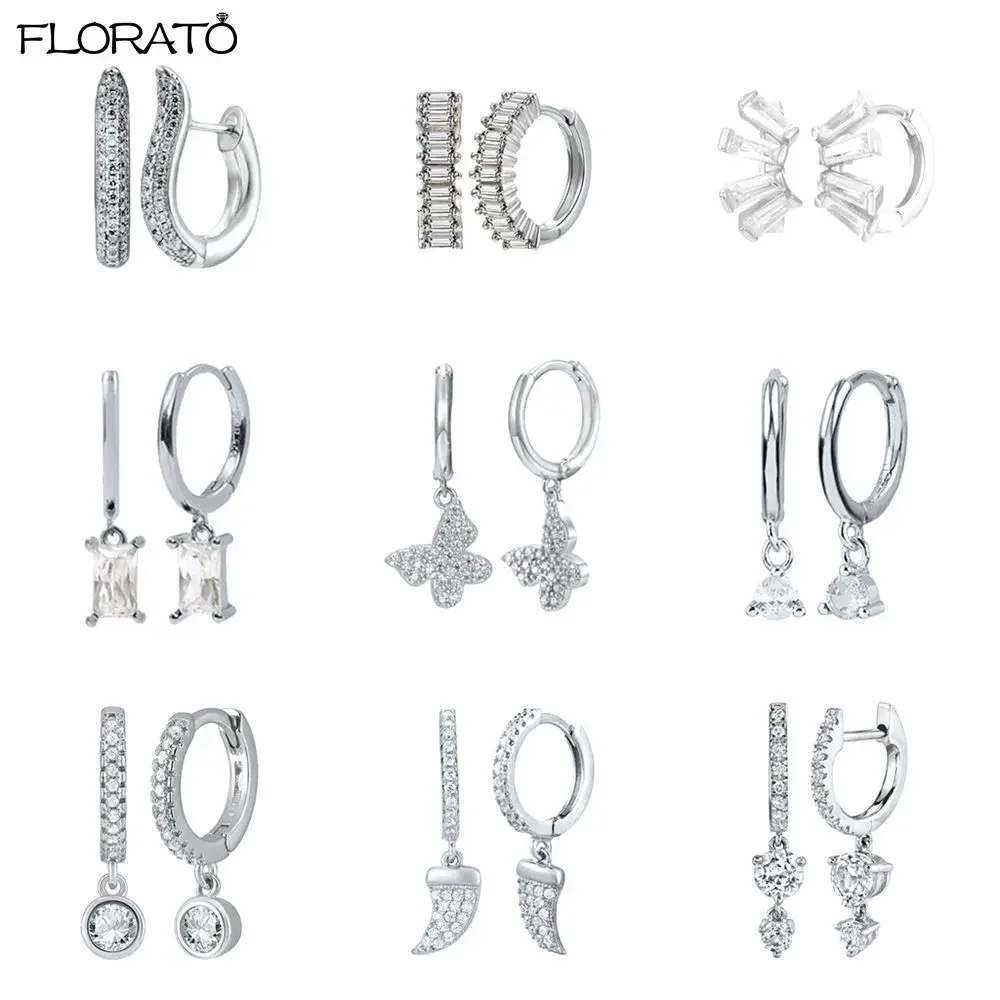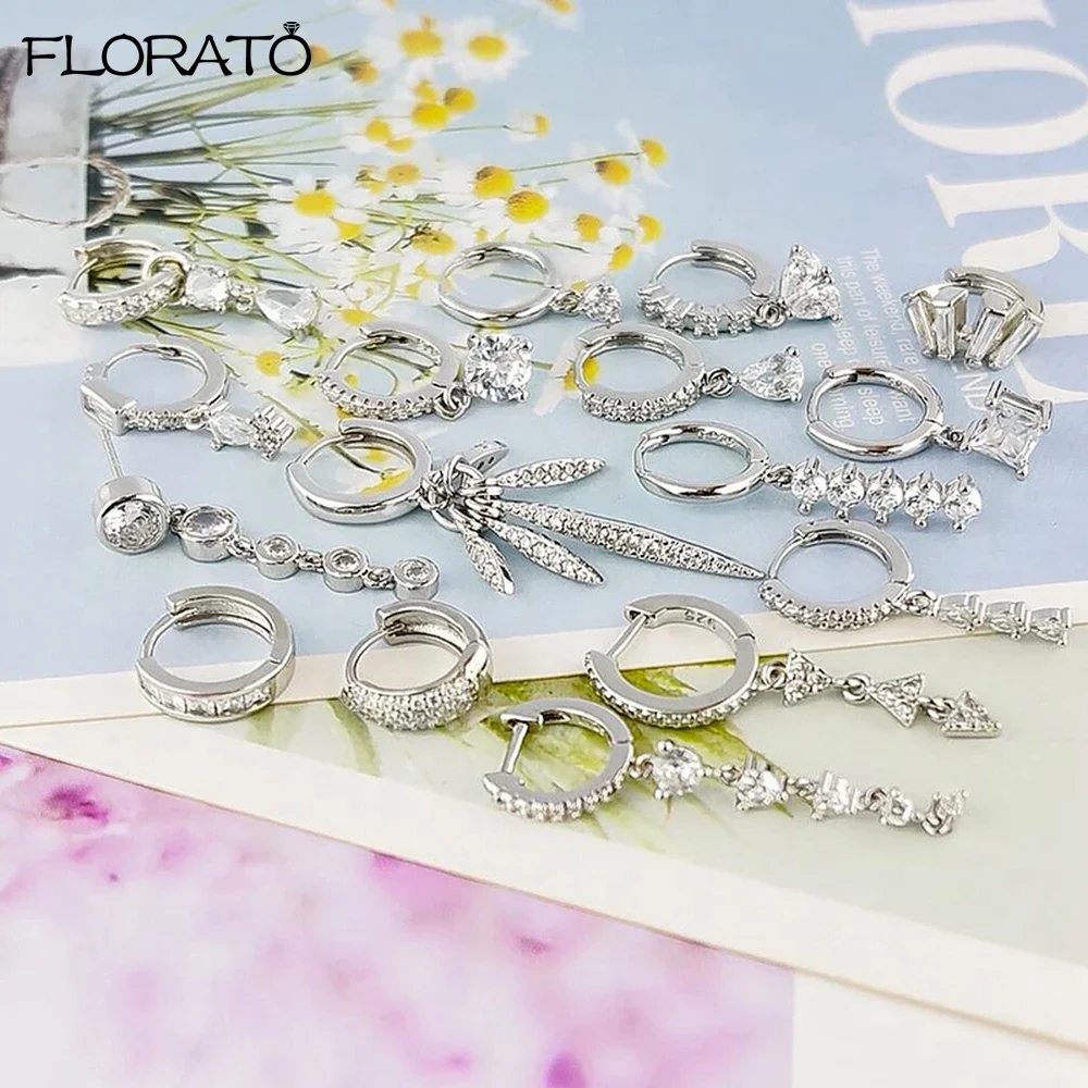 925 Sterling Silver Needle Fashion Geometric Pendant Hoop Earrings for Women White Zircon Earrings 2023 Trend Puncture Jewelry
