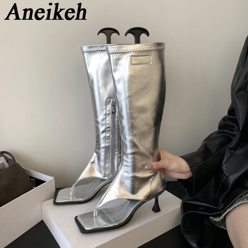 Aneikeh 2025 Sexy PU Square Head Clip Toe Sandals Boots Women’s Thin Heel Side Zipper Sewing Chelsea Knee High Boots Party Ball