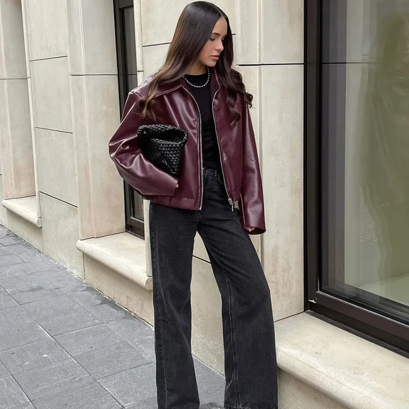 Angola Red Jacket Leather Motorcycle Street Fashion 2024 Autumn and Winter New Top Women’s Elegant Coat