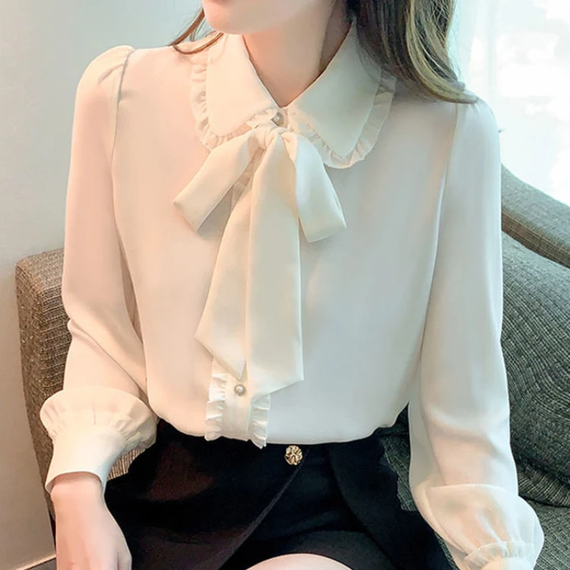 Bow Tie White Chiffon Shirt 2022 Spring Summer Korean Fashion Blouse Lace Elegant Long Sleeve Shirt for Female Casual Clothing