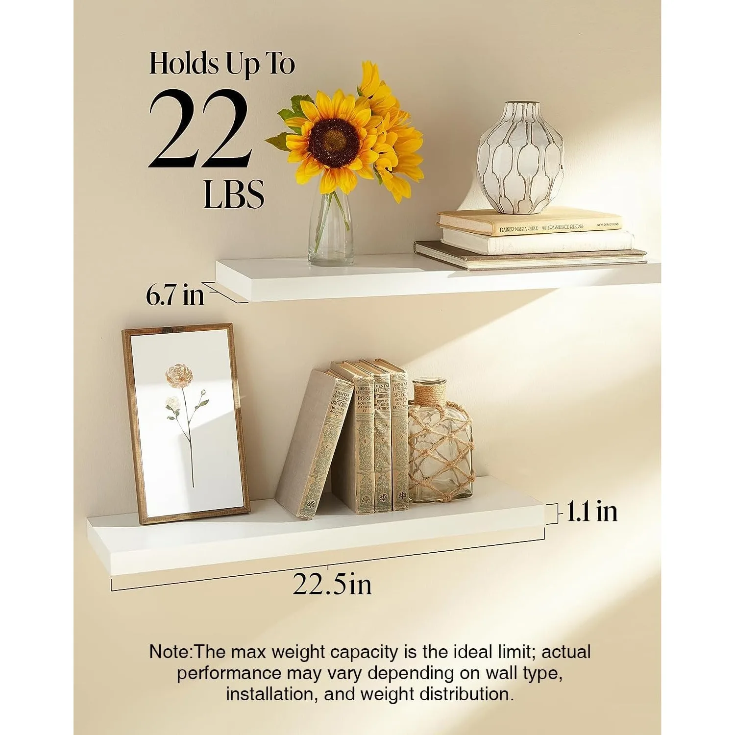 Floating Shelves, 22.5″ Wall Mounted Rustic Wood Shelves for Bathroom, Bedroom, Living Room, Kitchen, Office, (White, Set of 2)