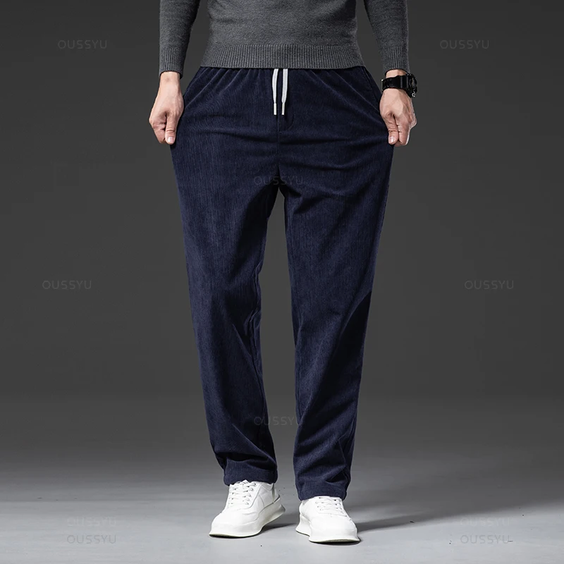 Four Seasons Men’s Corduroy Casual Pants Elastic Waist Business Fashion Straight Loose Trousers Male Black Khaki Blue M-5XL