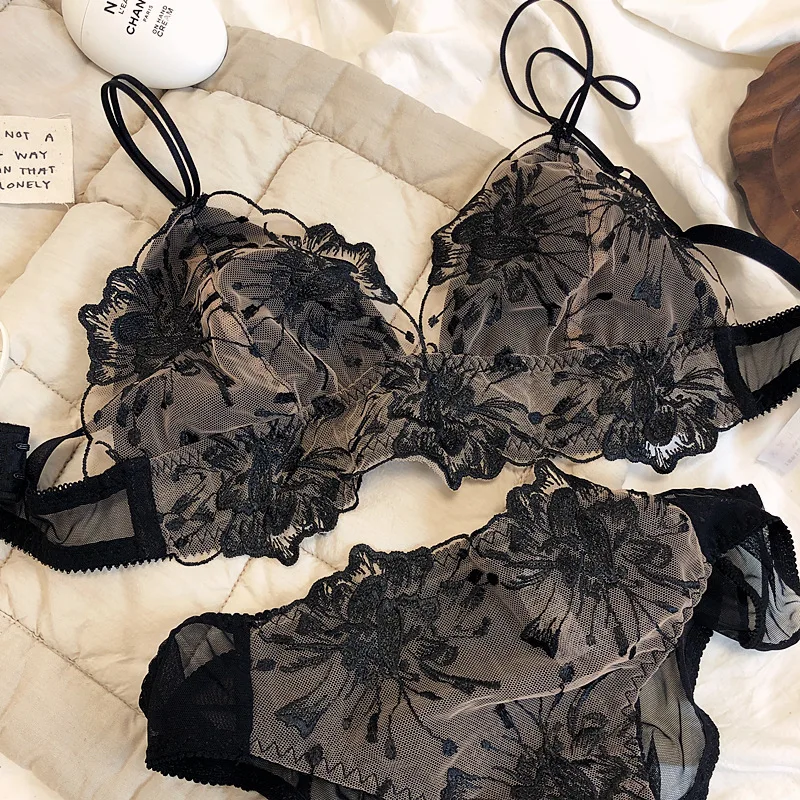 French Lace Flowers Embroidery Bra Set Ultra Thin Women Underwear New Triangle Cup Wire Free Bralette Romantic Lingerie Set