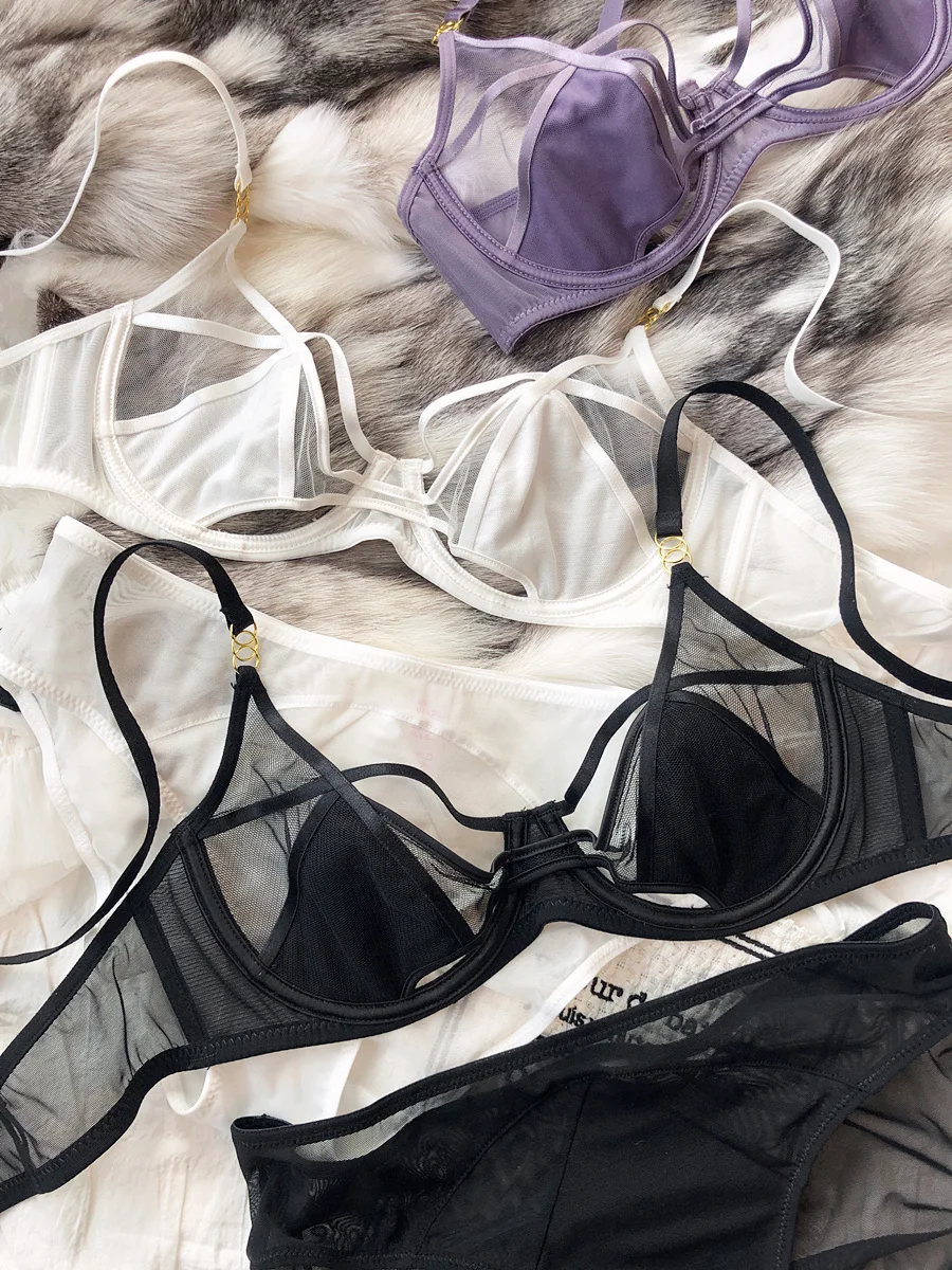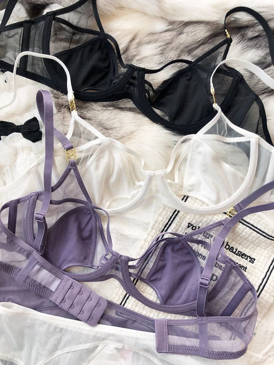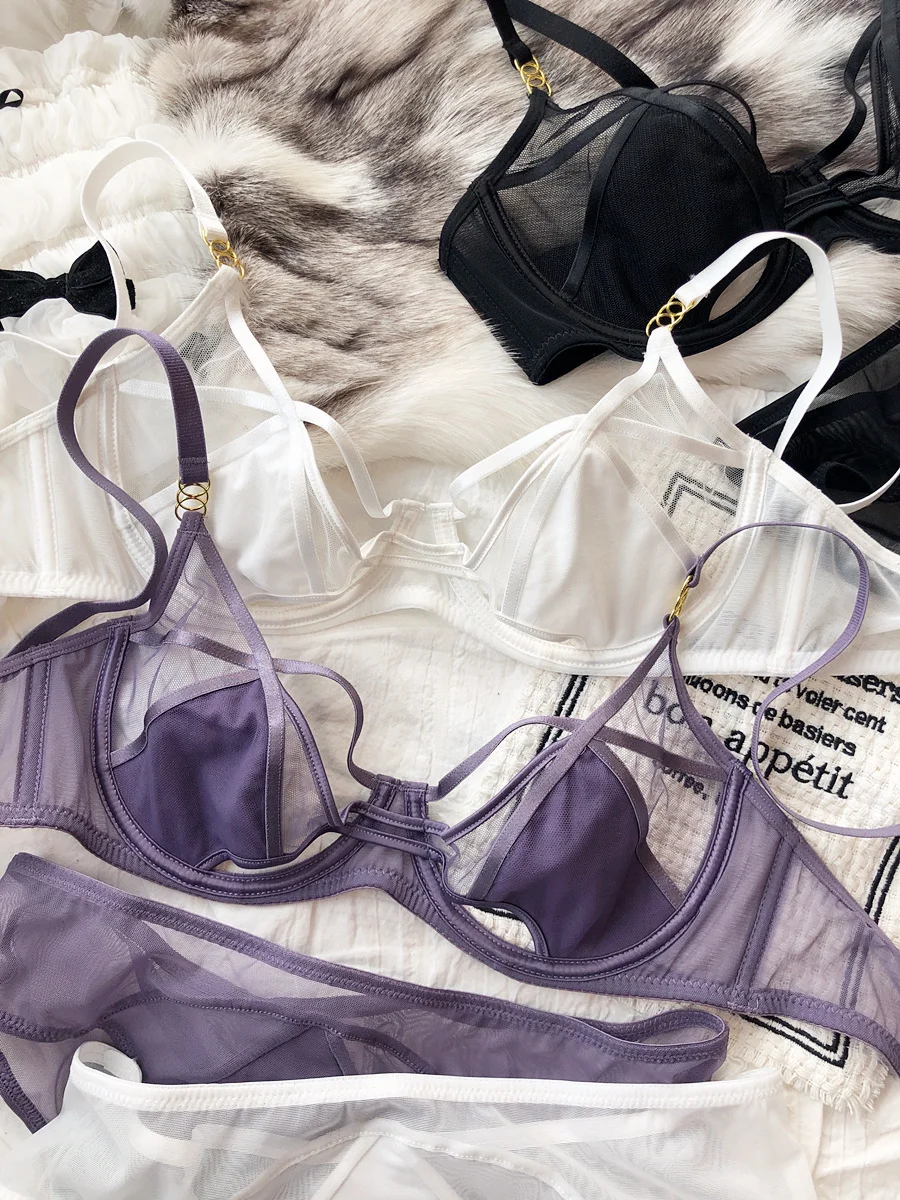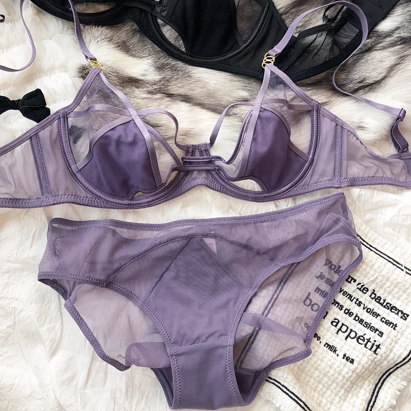 Hollow Lingerie Set French Ultra Thin Women Bra Summer Breathable Purple Plus Size 95CD Cup Underwear Push Up Brassiere