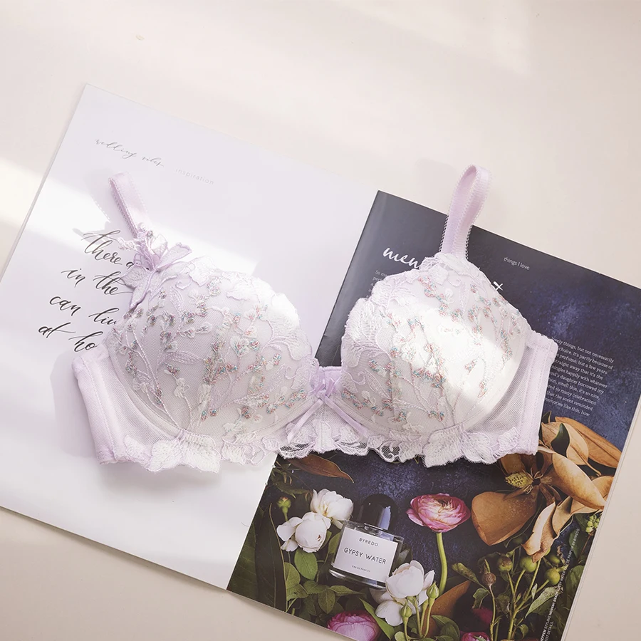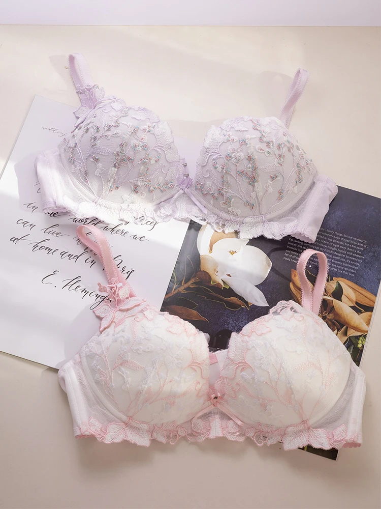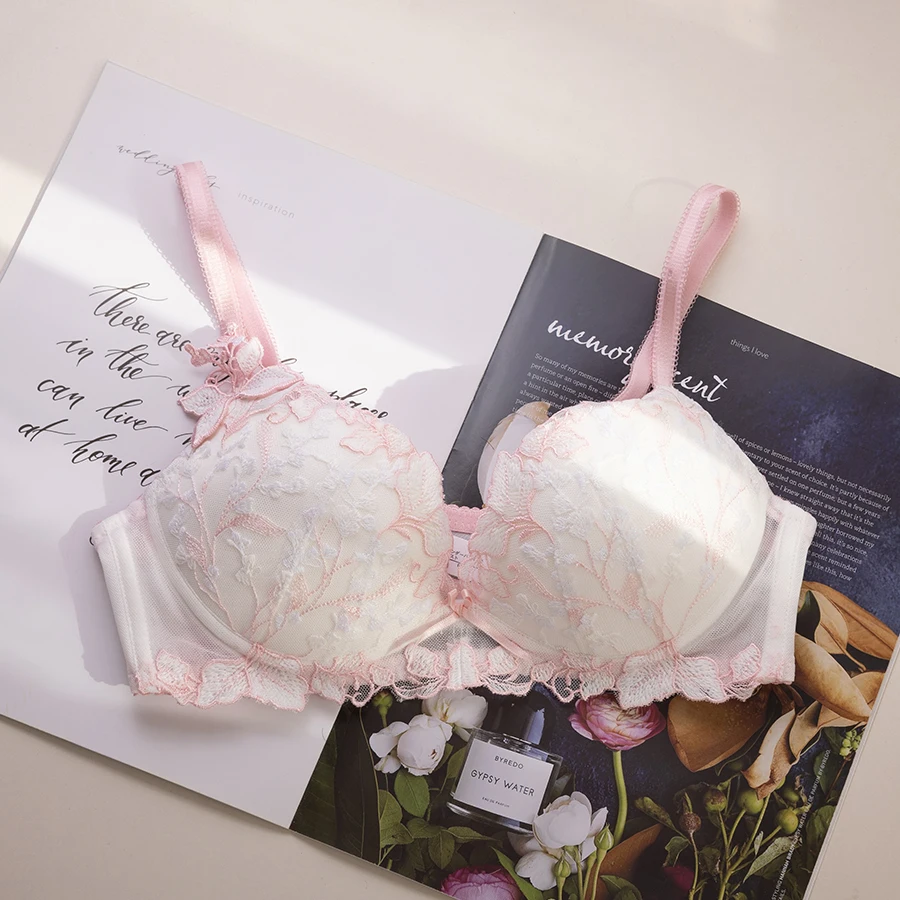 Japanese sweet cute girls lingerie without steel ring low chicken heart gathered embroidered flowers underwear set women bra set