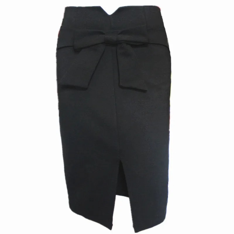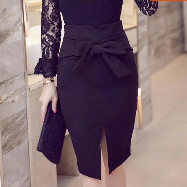 Korean Bow Pencil Skirt Women High Waist Slit Office Bodycon Skirt
