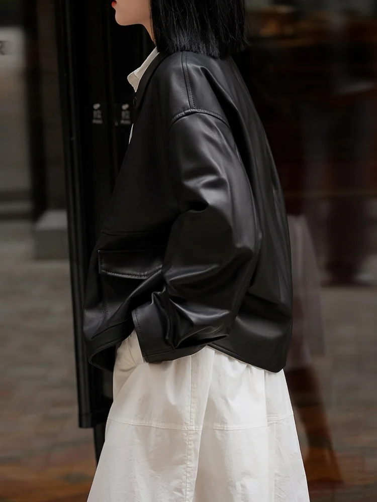 Leather Jacket with Pockets Buttons Front Faux Leather Coat Lapel Collar Long Sleeves Tops Autumn/Winter Woman Clothing