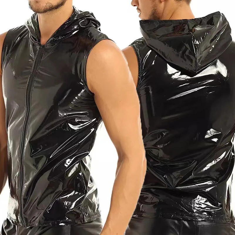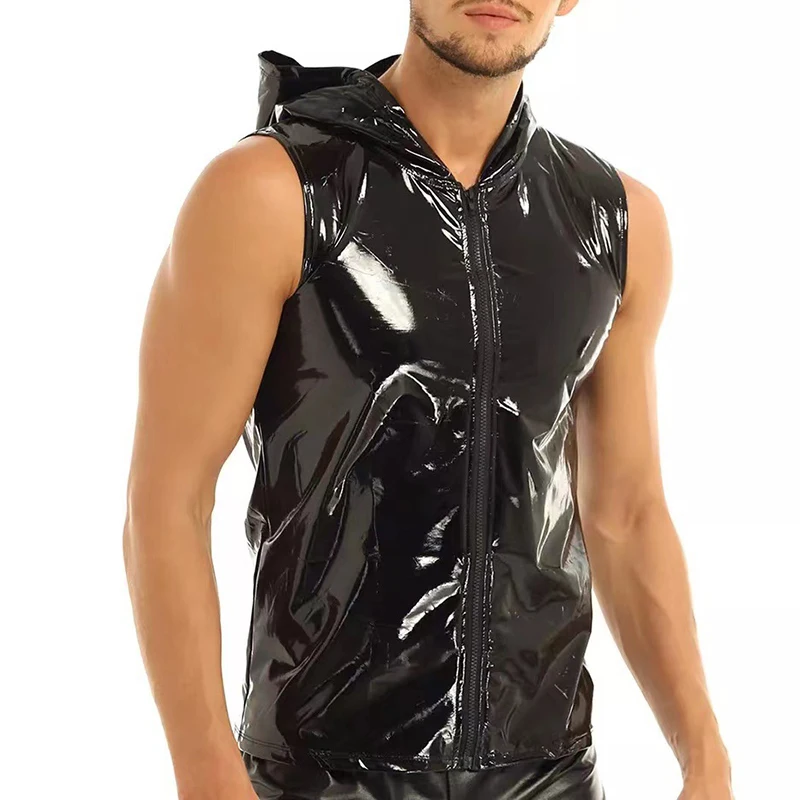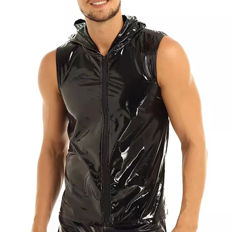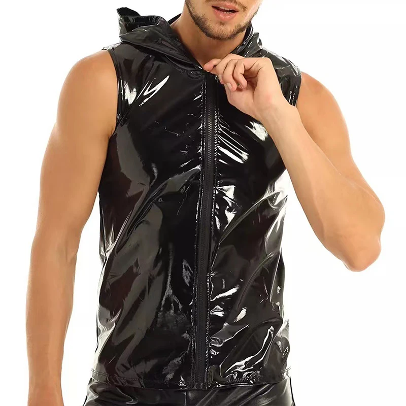 Men PVC Hoodies Tank Tops PU Leather Zipper Sleeveless Latex Hooded Shirts Vest Sexy Party Clubwear Fitness T-shirts Streetwear