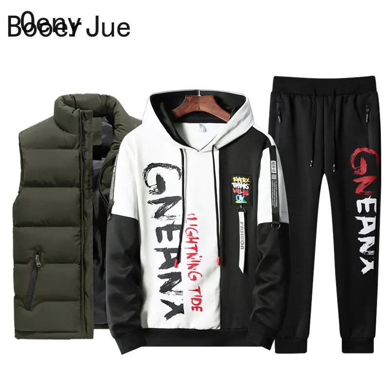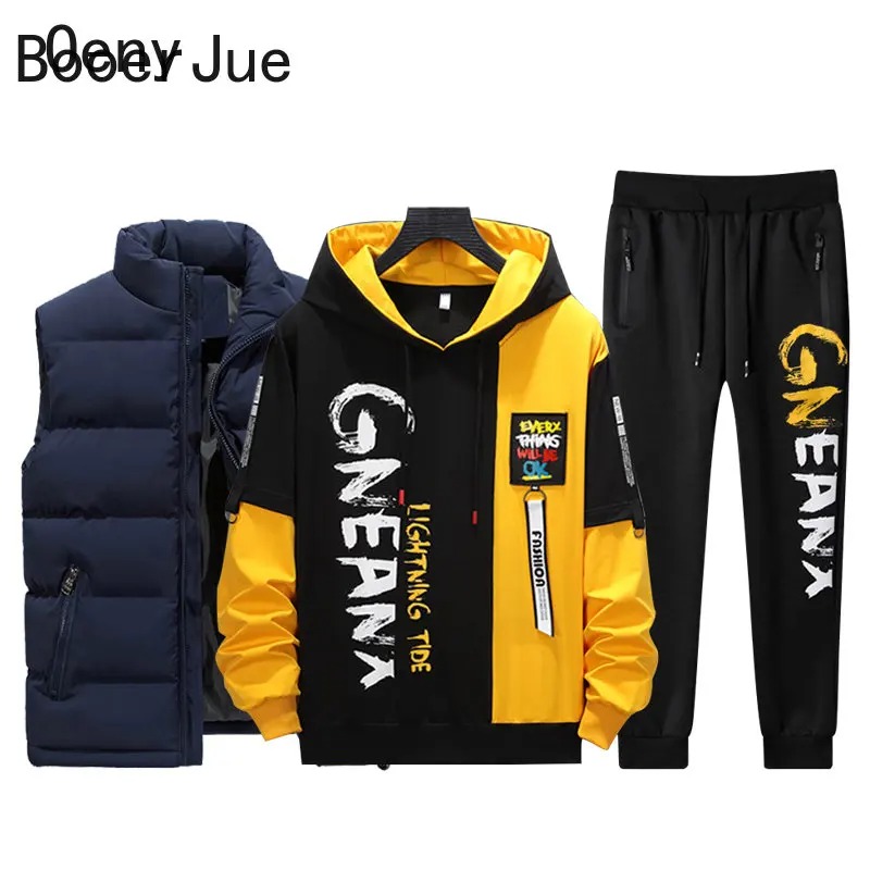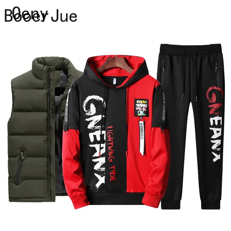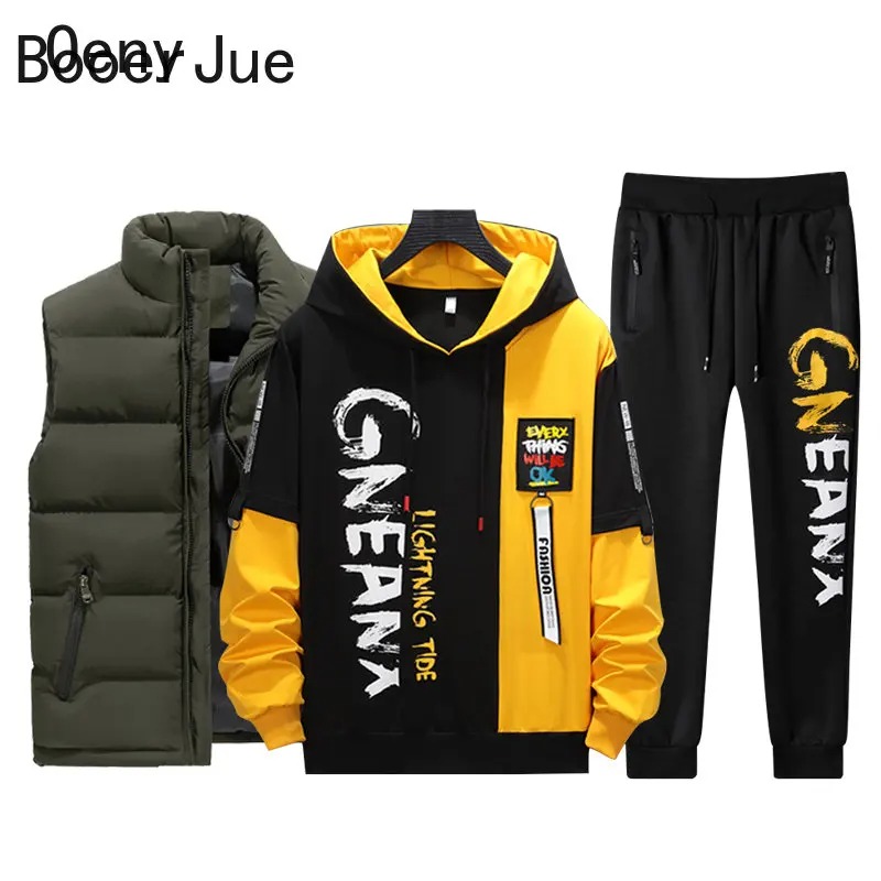 Upgrade your casual and sportswear collection with this men’s 3-piece tracksuit set, featuring a vest, printed sweatshirt, and matching sweatpants. Designed with a modern patchwork and printed style, this set delivers both comfort and street-ready fashion.