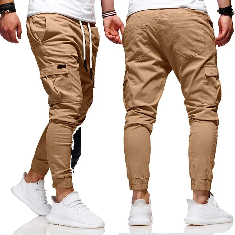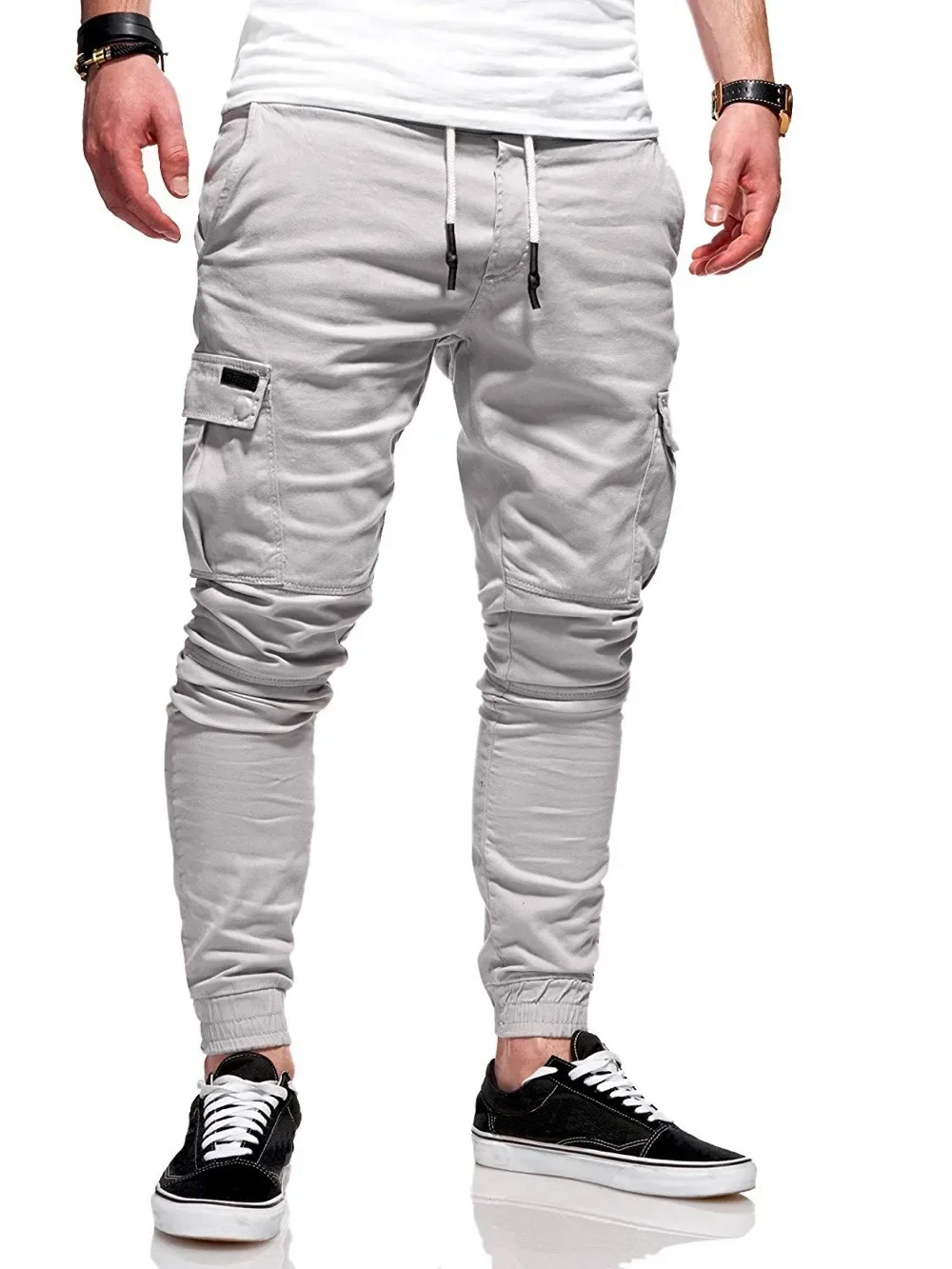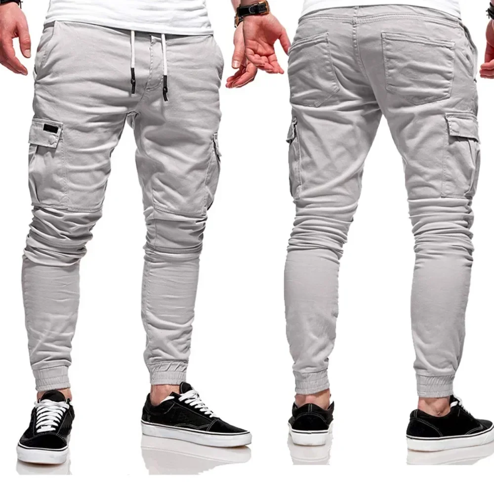 Men’s Jogging Pants Denim Flip Pocket Side Drawstring Waist Overalls Leisure Elastic Sports Pants Training Tactical Pants