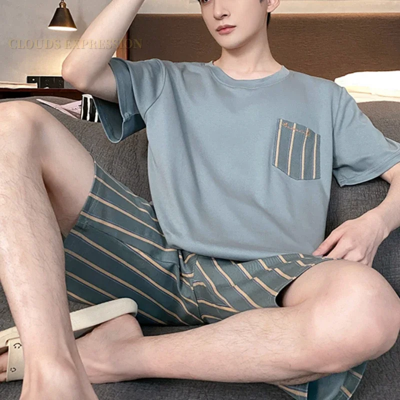 Summer Faux Cotton Knitted Short Sleeved Mens Pajamas Sets Polka Dots Black Pajama For Men Sleepwear Suits Homewear Big 4XL Size