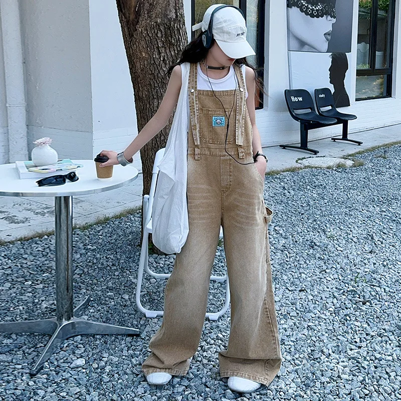 summer teen girls water washed punk wide leg jumpsuit junior kids loose slimming casual Cowboy overalls 4-14 child ropa trousers