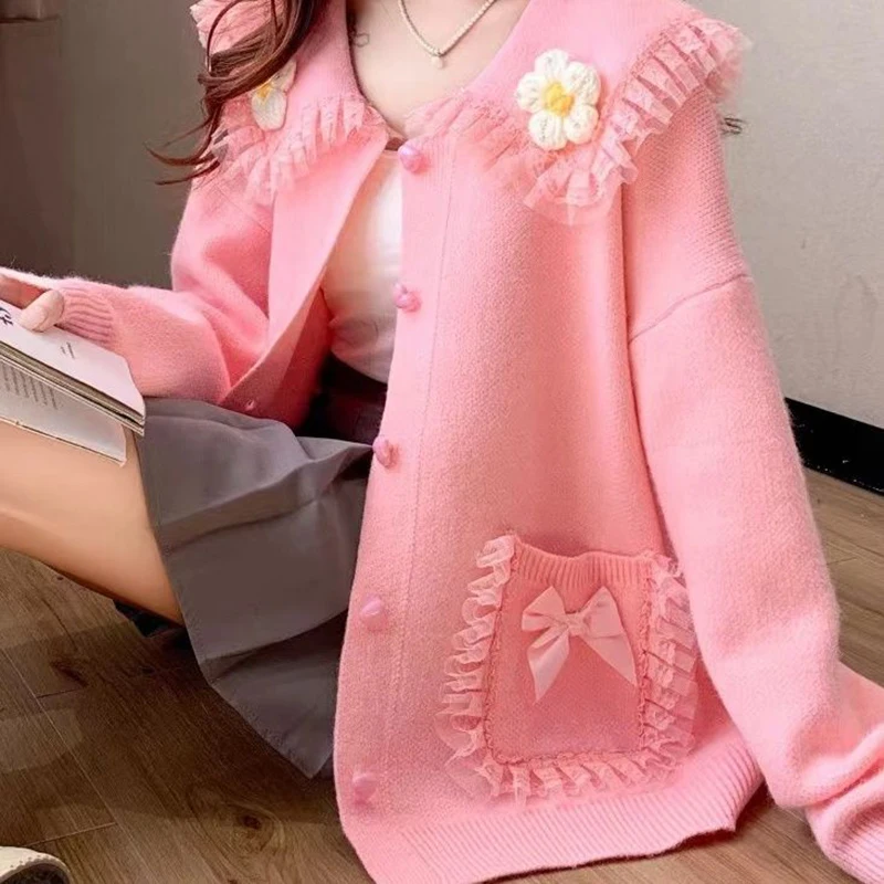 Sweet Peter Pan Collar Pockets Bow Lace Cardigan Sweaters Female Clothing 2024 Autumn Winter New Loose Knitted Young Style Tops