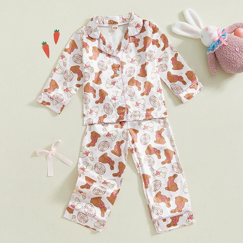 Toddler Girl Easter Satin Pajama Set with Bunny and Carrot Print Long Sleeve Button-up Tops and Pants Sleepwear Outfit 2 Piece