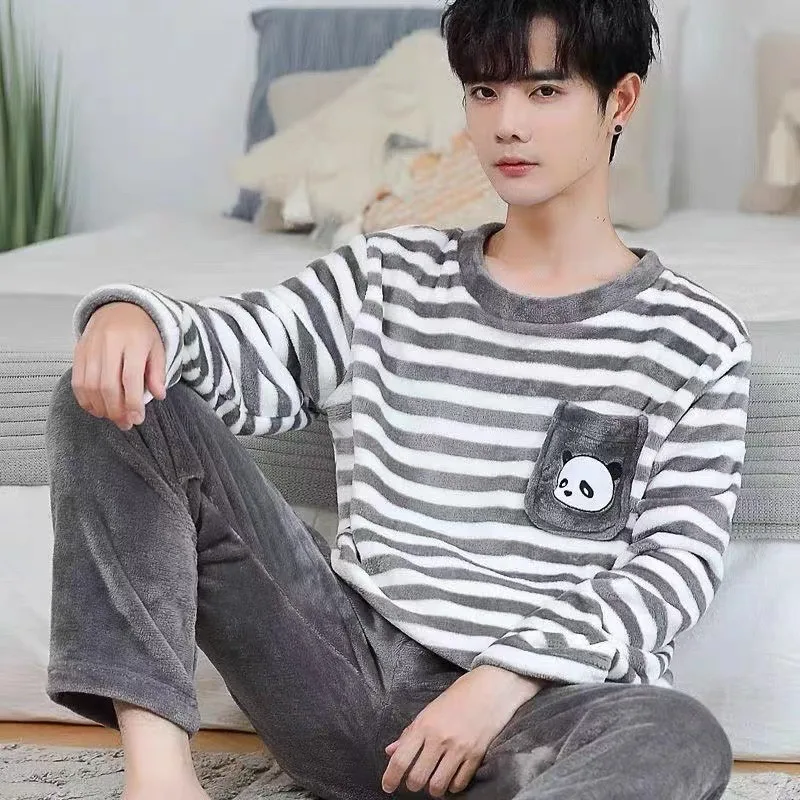Winter Flannel Pajamas Men Korean Version of the Striped Padded Long-Sleeved Cartoon Nightwear Homewear Set Sleepwear Loungewear