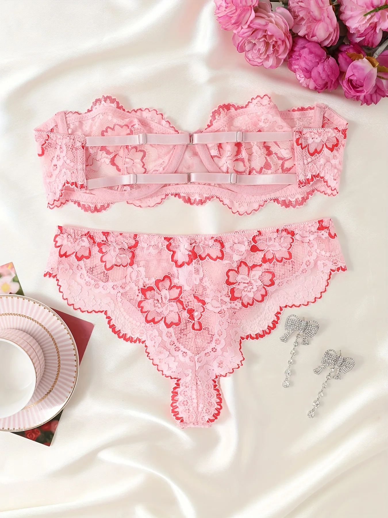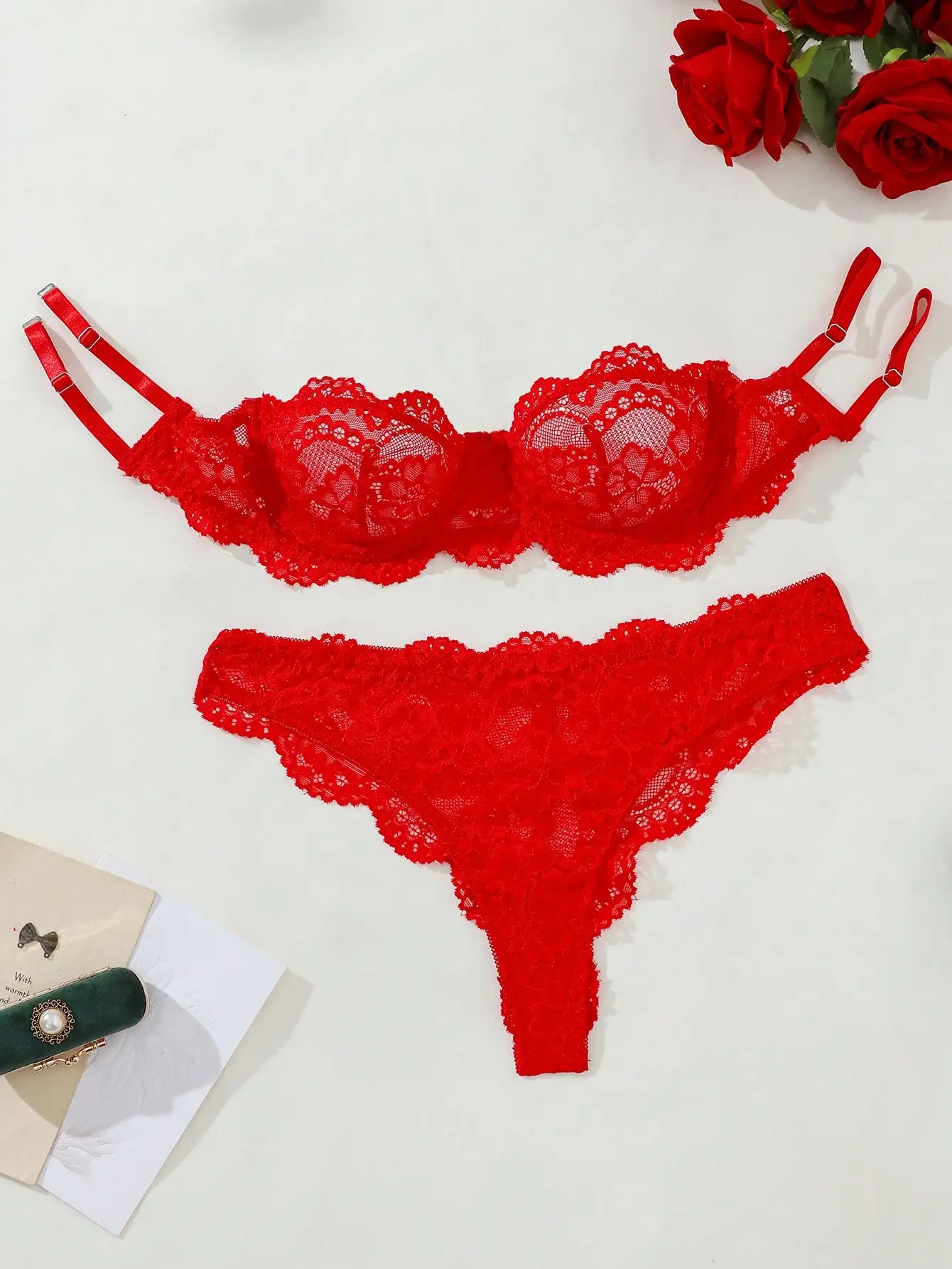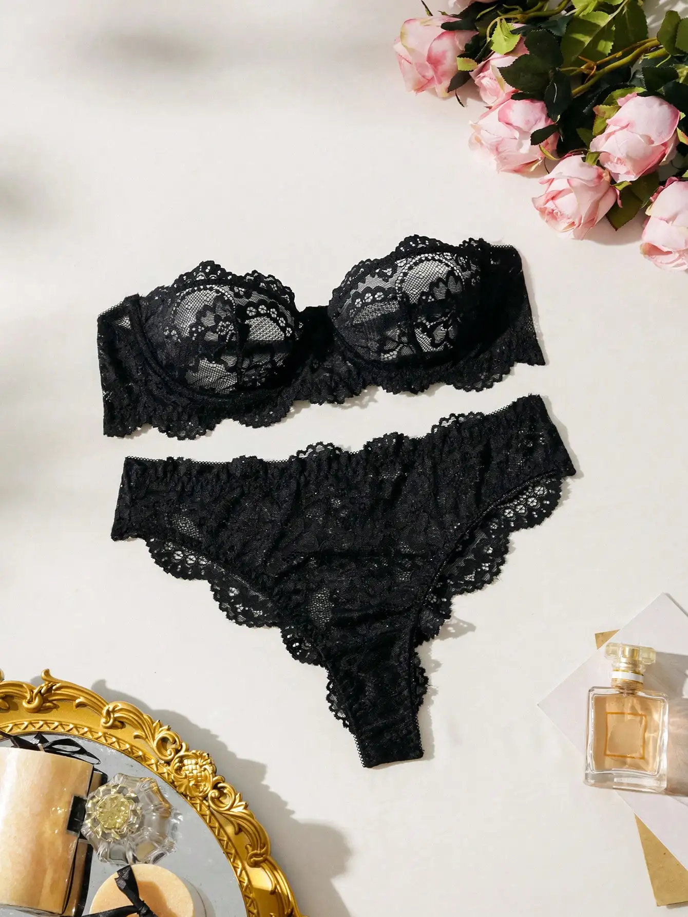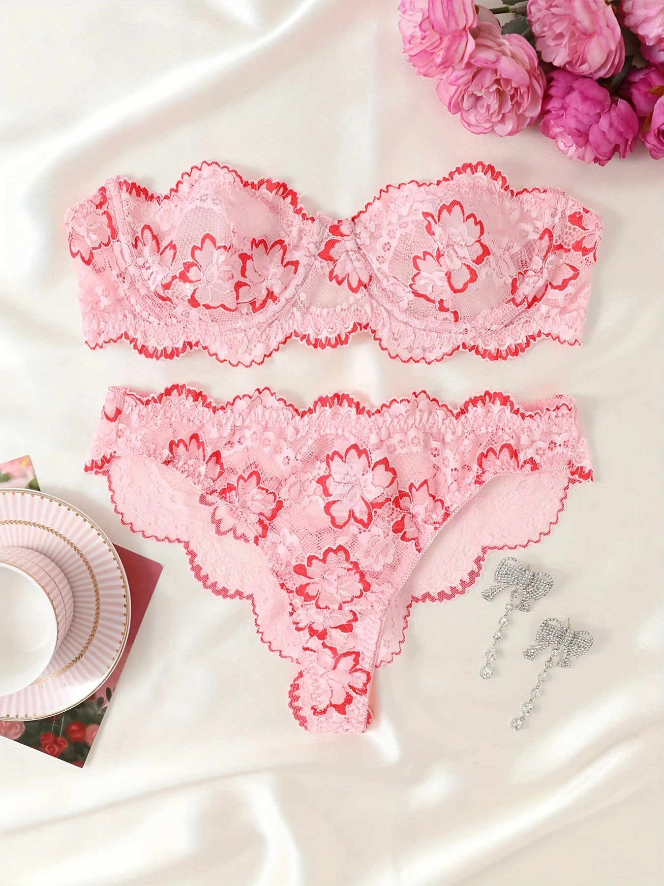 Women’s Floral Lace Lingerie Set Underwire Bandeau Bra & Scallop Thong, Breathable Comfort for Daily Wear All Seasons
