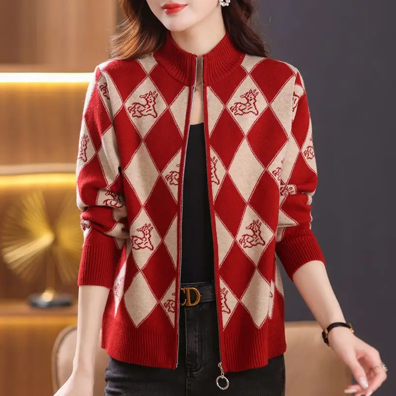 Women’s Korean Vintage Plaid Sweaters Cardigan Autumn Winter Casual All-match Stand Collar Zipper Knitted Tops Female Clothing