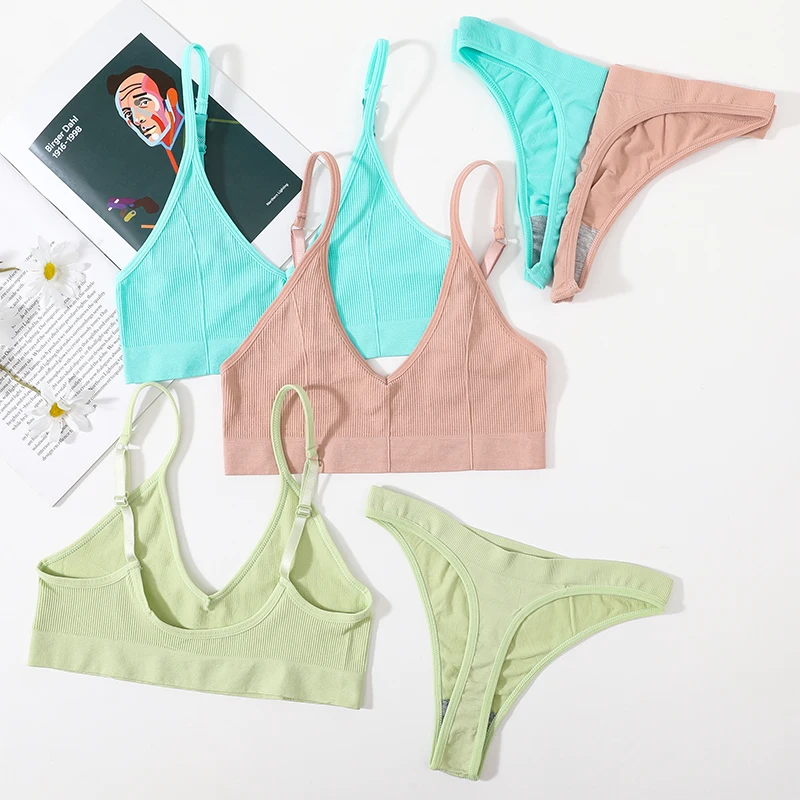 Women’s Seamless Bra Set Lingerie Wireless Low Rise Panties Ribbed U-Back Crop Top Bralette Comfortable Sport Underwear