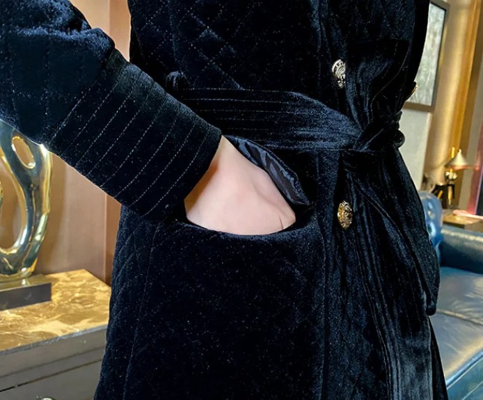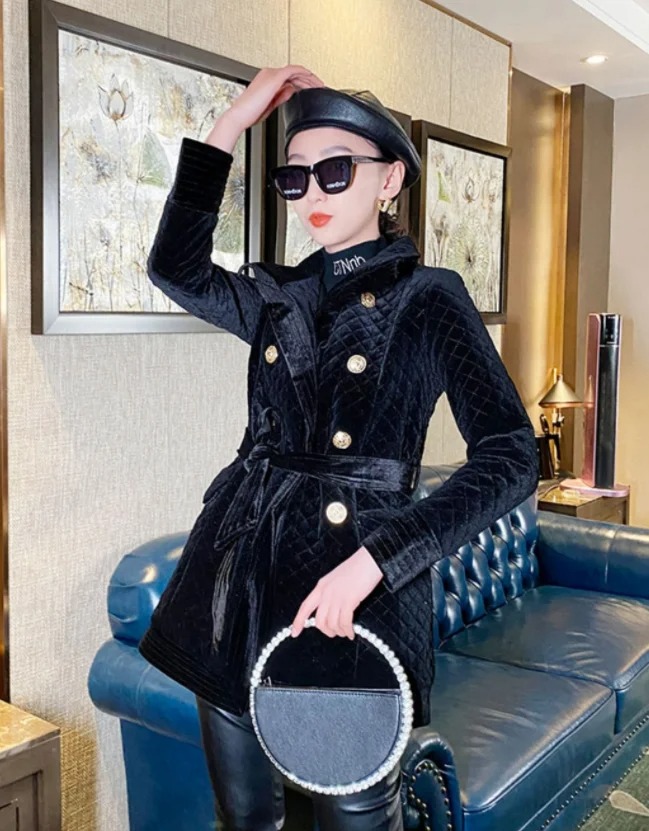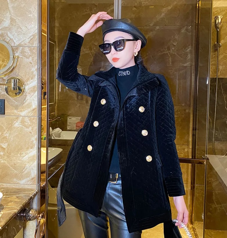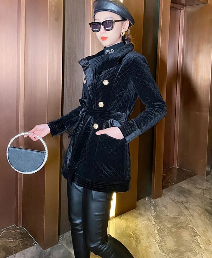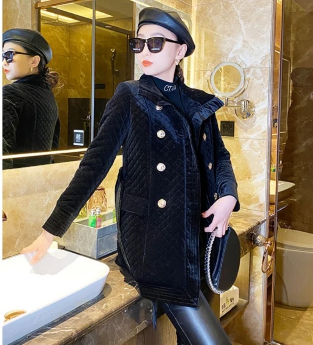 Stay warm in style with this women’s velvet cotton quilted coat. Designed in a classic black diamond plaid pattern, this mid-length coat offers both elegance and comfort. The soft velvet cotton fabric with quilted padding makes it perfect for chilly autumn and winter days while keeping your look polished and modern.